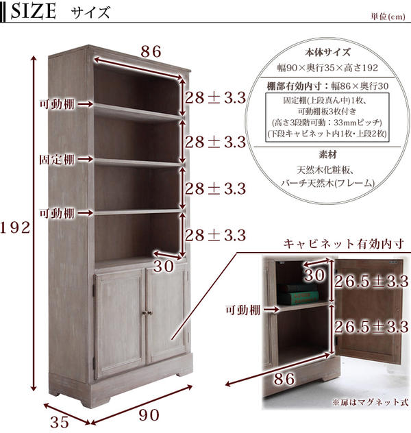 サイズ 本体:幅90×奥行35×高さ192cm 棚有効内寸:幅86×奥行30×高さ28±3.3cm※固定棚1枚、可動棚2枚 扉収納有効内寸:幅86×奥行30×高さ26.5±3.3cm※可動棚1枚 仕様 天然木化粧板、バーチ天然木(フレーム) 固定棚(上段真ん中)1枚 3段階可動棚板3枚付き(下段キャビネット内1枚・上段2枚) 備考 完成品 こちらの商品はアンティーク感を出すためにわざと使い古した様な仕上げ、塗装などを施こしております。