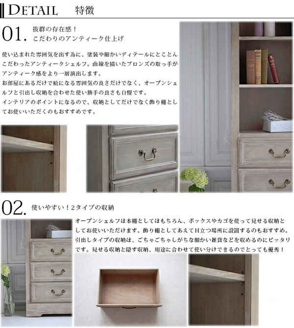 ※こちらの商品の配送区分:【D】 重た〜い家具の開梱・設置や梱包材撤去を丸ごとお任せ!開梱設置をご希望の方はこちら 商品名 シャビーシックシリーズ ブックシェルフ 幅60cm 商品説明 〇アンティーク仕上げにこだわったシャビーシリーズ。