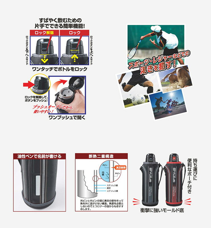 商品サイズ:幅10.5×奥行10.5×高さ34cm 850g材質本体=ステンレス鋼中栓・蓋・飲み口=ABS樹脂・ポリプロピレン樹脂パッキン=シリコンゴムポーチ・側面・底面=PVC(塩化ビニール)・EVA(エチレン・酢酸ビニル共重合樹脂)原産国:中国 完成品保温・保冷対応保温効力=76℃以上(6時間)保冷効力=8℃以下(6時間)ワンタッチ開閉=中栓の開閉は指1本でOKですステンレス製で軽くて・丈夫 学校・キャンプに大活躍ワンタッチ中栓ですばやく飲め、冷たいコールド・熱いホットドリンクのどちらでもOK1.5Lの大容量、魔法瓶構造のスポーツマグすばやく飲むための片手でできる簡単操作ワンタッチでボトルをロック ロックを解除してボタンをプッシュ ワンプッシュで開き、使いやすさバツグン保温・保冷力に優れたステンレス魔法瓶仕様(断熱二重構造=外ビンと内ビンの間に真空の壁を作って熱を外に逃がさない構造 熱源を使用しないのでエコロジーの面からもお勧めします)です持ち運びに便利なポーチ付きで、衝撃に強いモールド底です油性ペンで名前を記入でき、ホットドリンクも、コールドドリンクも使える温・冷両用スポーツマグです【代引きについて】こちらの商品は、代引きでの出荷は受け付けておりません。