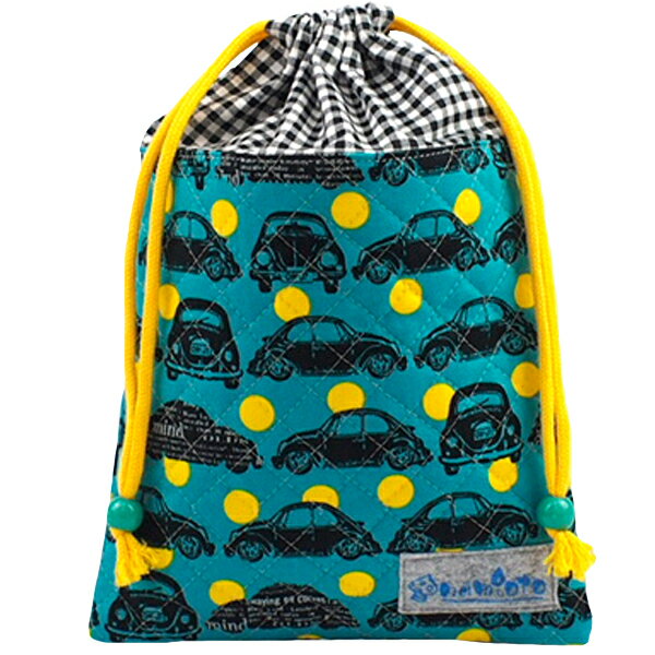 クラシックカー ターコイズ キルティング巾着 ハンドメイド namioto 安心 安全 日本製 キルティング 小物入れ 丈夫 巾着 コップ入れ 巾着袋 お着替え入れ 弁当箱 持ち手付き 体操着入れ キルトポーチ 幼稚園 保育園 車 ターコイズ ブラック チェック 男の子 おしゃれ